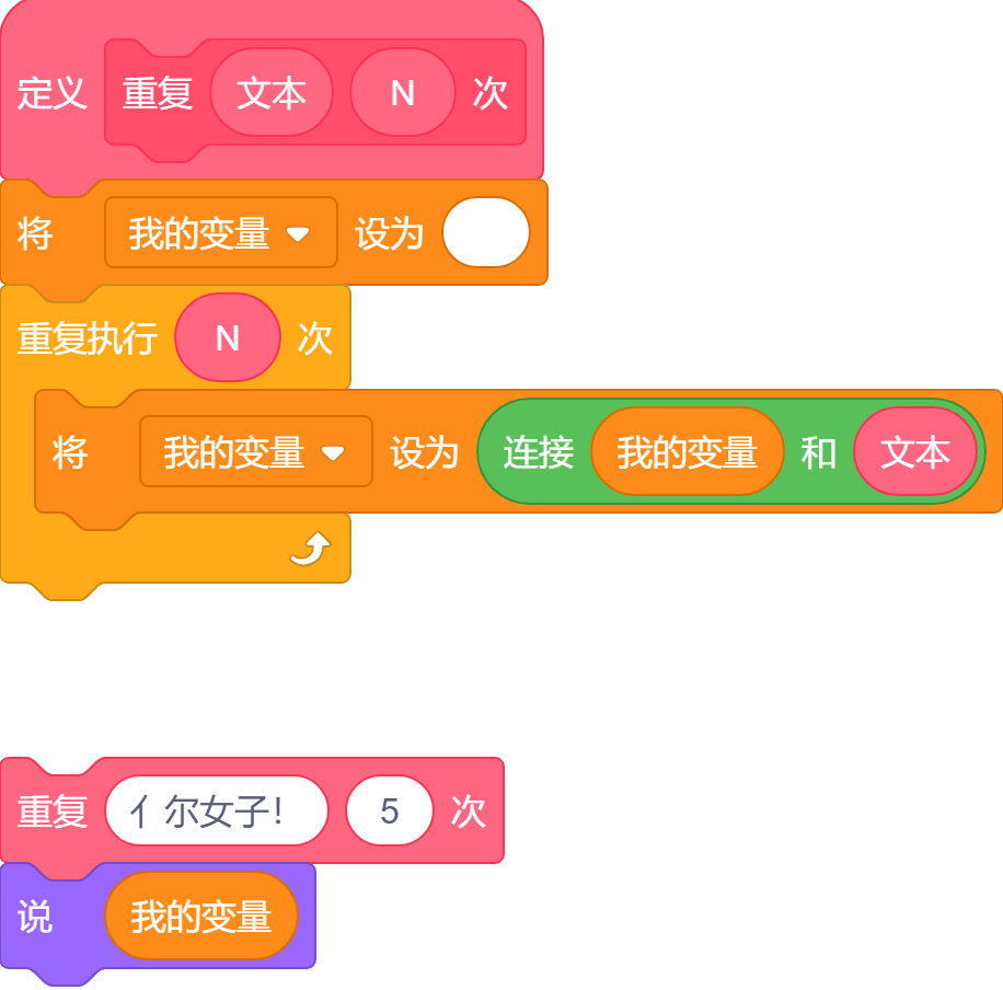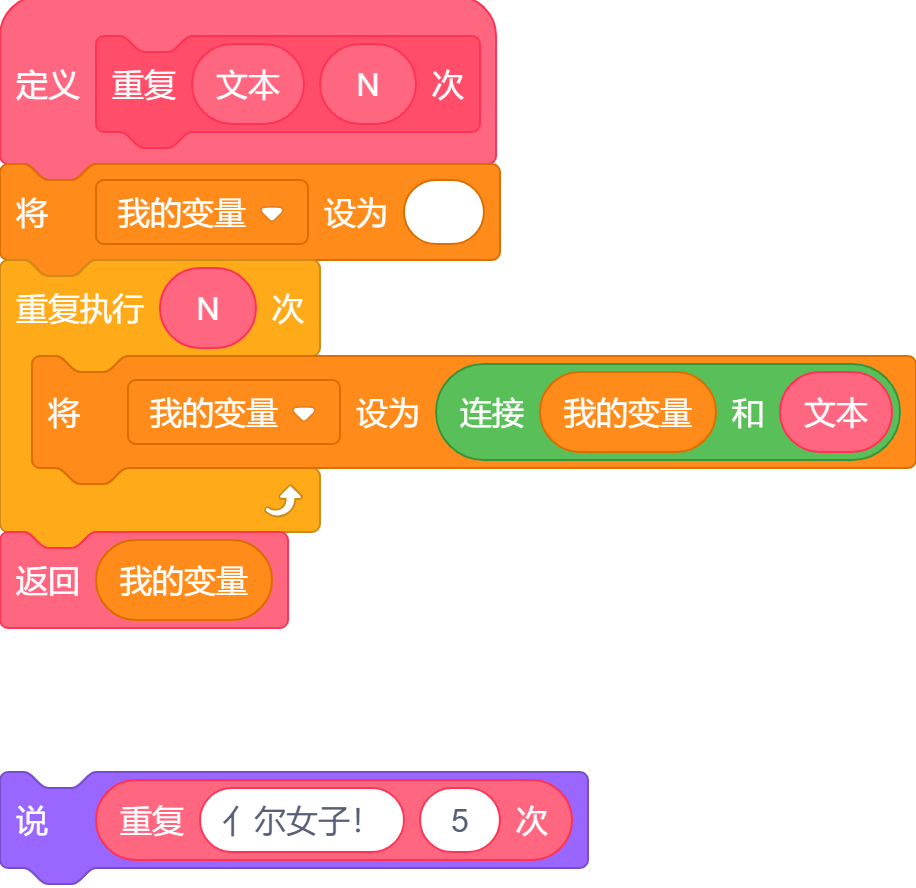 建议确保带有自定义返回值的块仅运行某些算法并输出最终答案。为确保您的作品在编译器和解释器中运行效果一致,带有自定义返回值的块应避免诸如移动精灵、显示文字、等待等操作。
