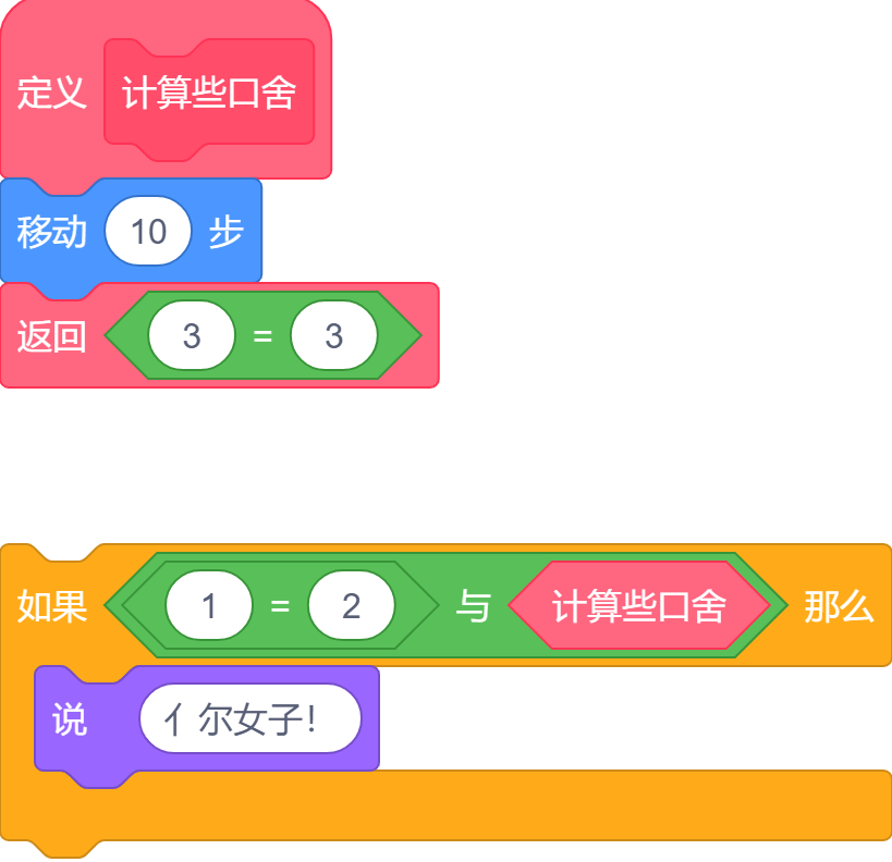 为了提升性能,编译器有一个名为短路运算的功能。想象一下这样一个 Scratch 块:“< (1 = 2) 与 (3 = 3) >”。当编译器遇到这个块时,它首先会计算“1 = 2”,这显然是错误的。在这种情况下,编译器甚至无需检查“与”块的另一侧,因为其结果不会有任何影响:最终结果始终为假。通常这只是节省性能,但如果您的块具有其他功能(例如移动角色),则会出现不同的行为,因为解释器会始终评估所有块。尝试执行这个脚本: